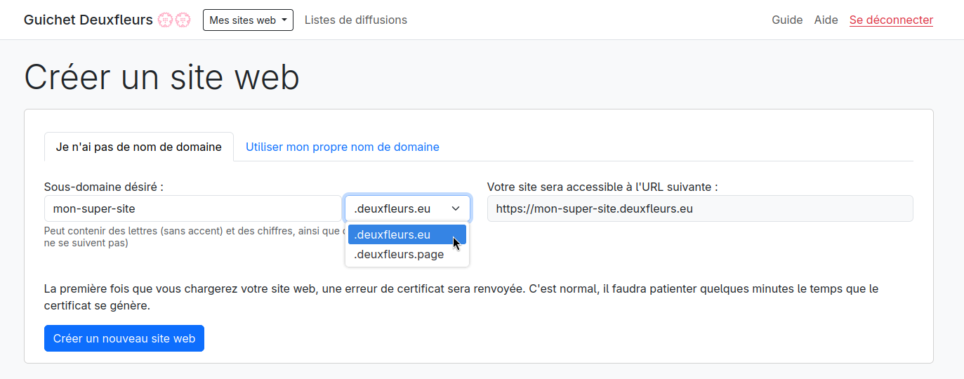 Cependant, il ne sera plus possible d’en créer de nouveaux dans le futur à l’adresse .web.deuxfleurs.fr, seulement sur les nouveaux domaines .eu et .page.